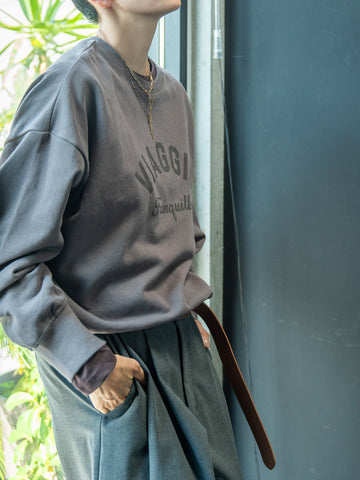 Tシャツ総選挙で多くの票を集めた、カレッジライクなロゴをプリントしたスウェット。ボディはヴィンテージスウェットをベースにしたデザインで、肩はドロップ仕様にすることで、着るだけで抜け感が出る仕上がりです。袖はゆったりとしつつ、袖口に向かって細くなるシルエットで、すっきりとした印象に。さらに袖口にはヴィンテージウェアから着想を得たディテールを取り入れ、さりげないこだわりをプラスしました。袖口や裾のリブはコンパクトに調整しているため、インナーをのぞかせても清潔感を保ちながら重ね着を楽しめます。ヴィンテージ要素を加えつつ、大人の女性がきれいめにもかっこよく着こなせるよう工夫を凝らした一枚です。