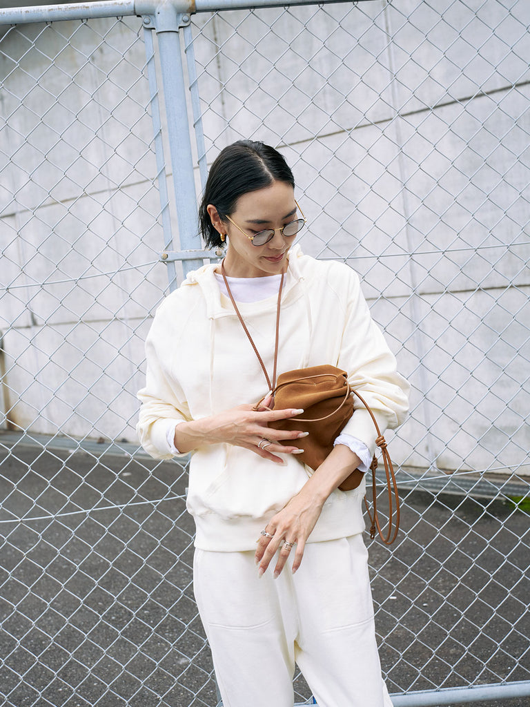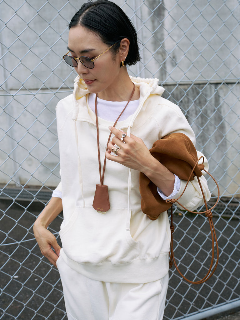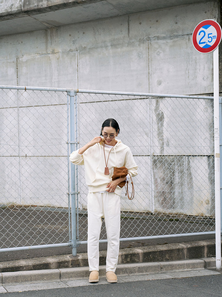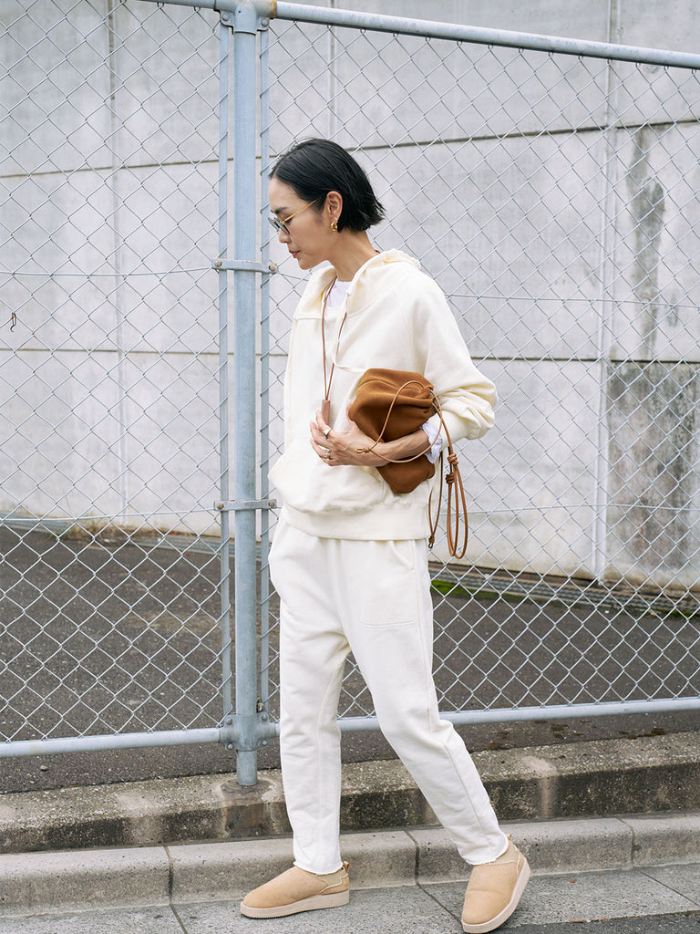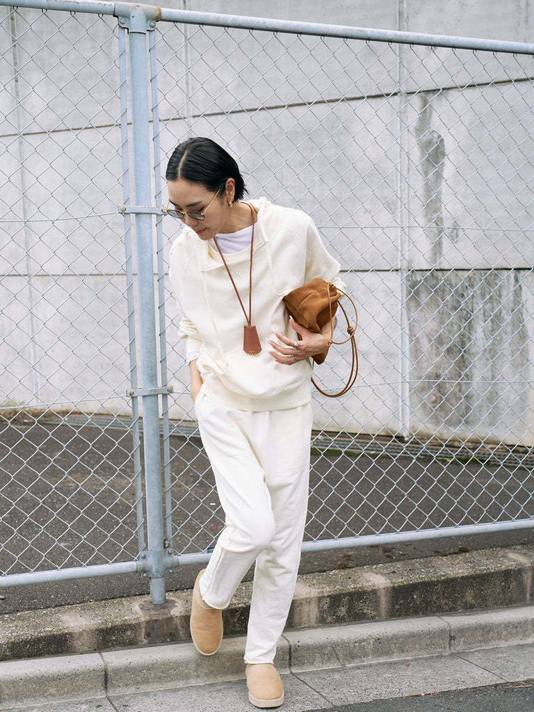 同素材を使用した「裏毛サルエルパンツ」と合わせれば、ルームウェア見えしない大人のセットアップに。スウェットながらきれいめボトムとも好相性で、バランスの取れた着こなしが可能です。ダメージデニムなどカジュアルなアイテムと合わせても、メンズライクになりすぎず自然に着こなせます。シャツやTシャツをインナーに重ねたレイヤードもおすすめ。小物は華奢なネックレスなど女性らしいアイテムを添えると、大人の上品な雰囲気が完成します。